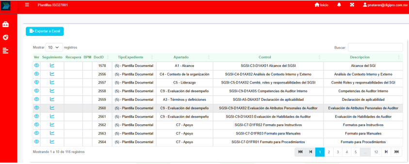 La plataforma cuenta con un set de plantillas que le servirán de guía para el llenado de los controles documentales que rige la norma ISO27001.